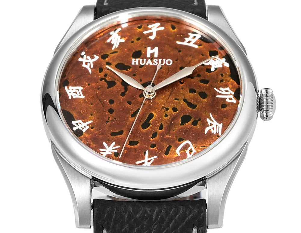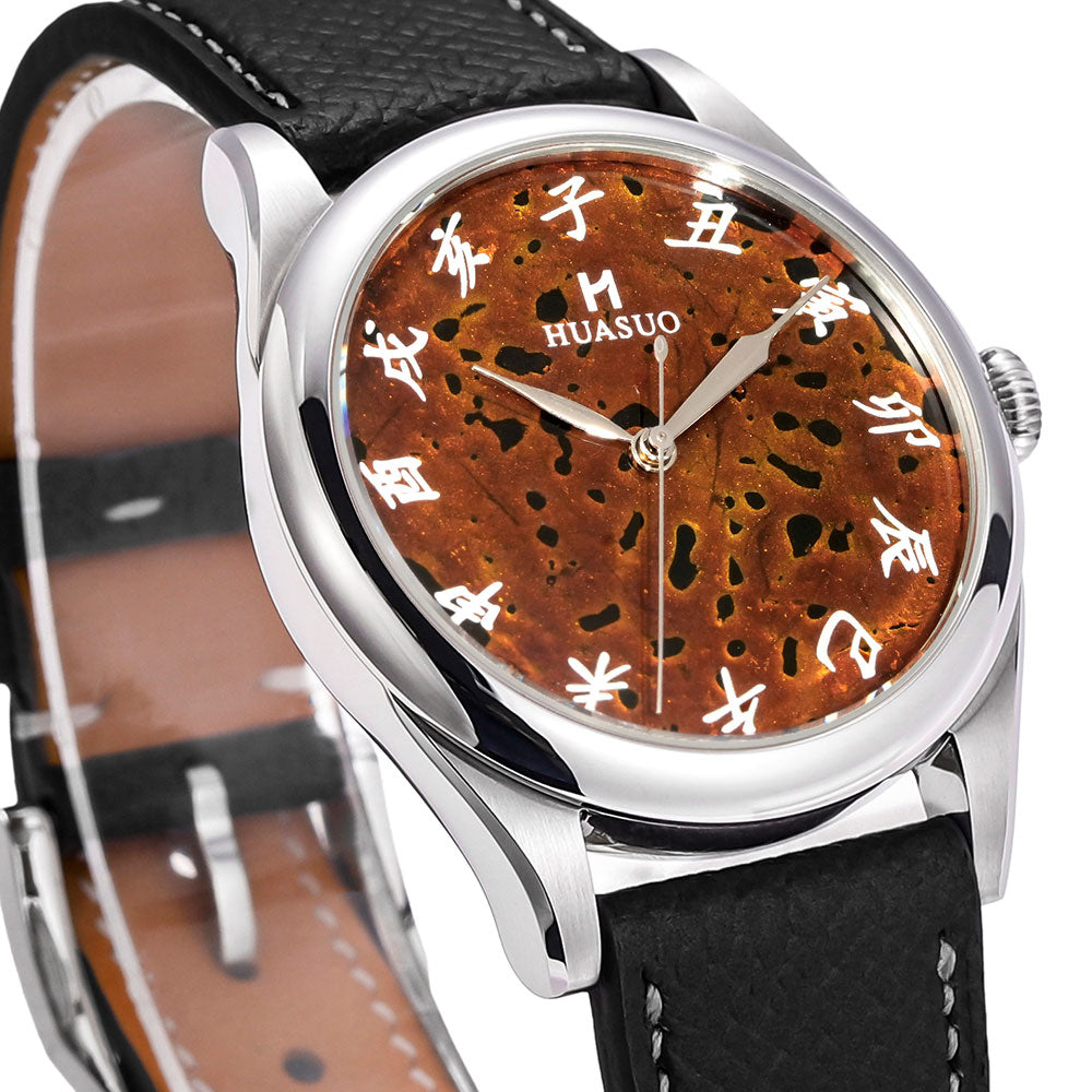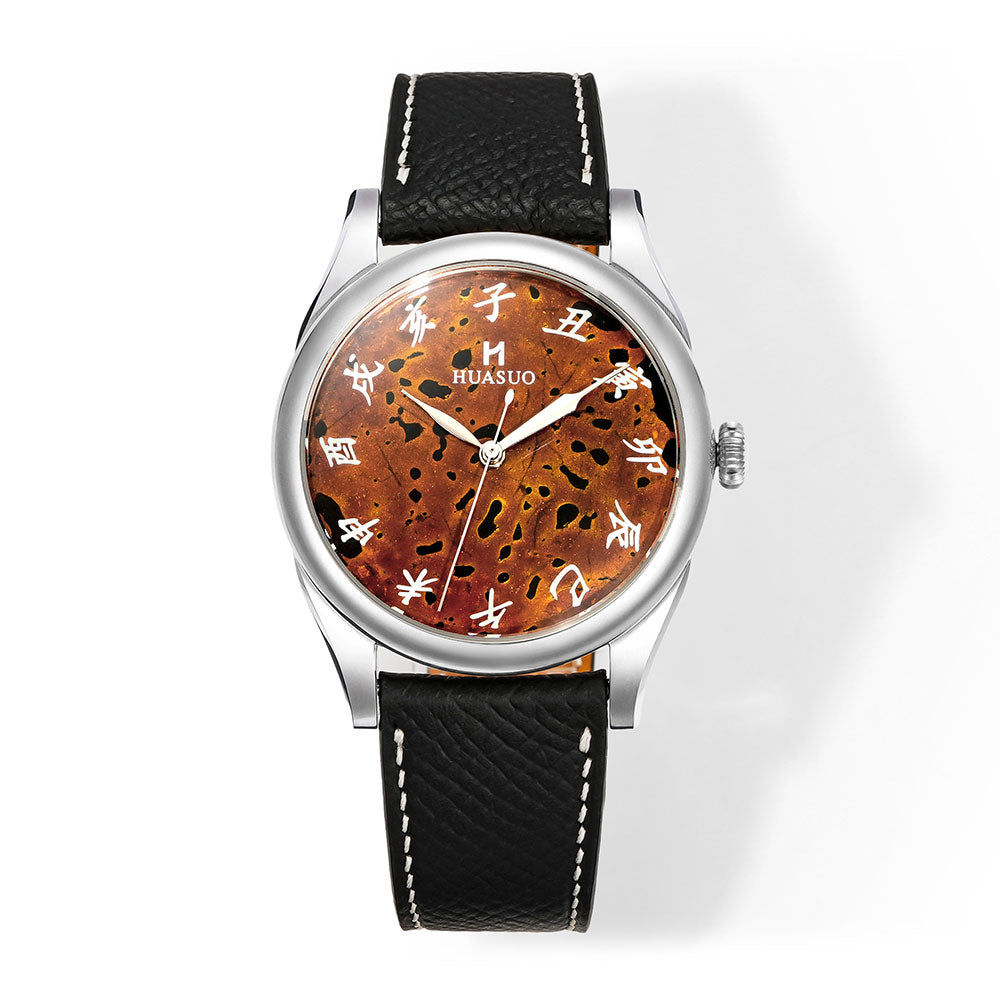 This is a mechanical watch crafted by HUASUO, featuring the exquisite artistry of China's intangible cultural heritage—rhinoceros lacquer. Each dial is meticulously handmade by skilled artisans, ensuring that every piece showcases a distinct and unique artistic texture rooted in ancient lacquer art. As a result, every mechanical watch becomes a one-of-a-kind masterpiece.
