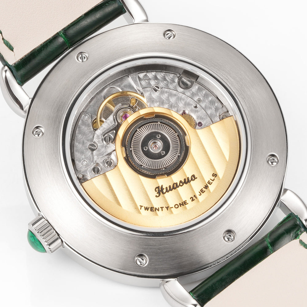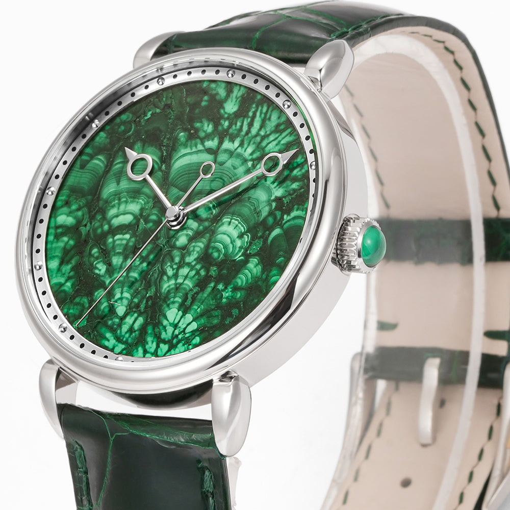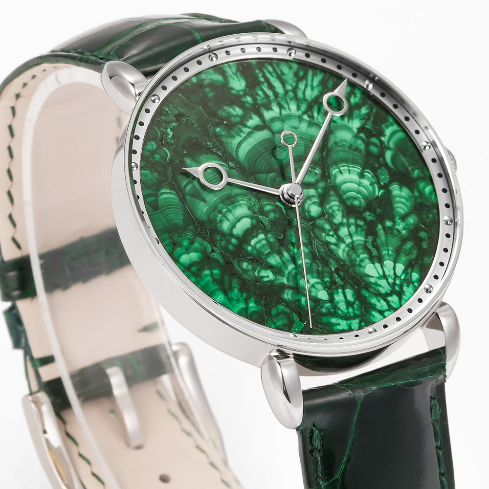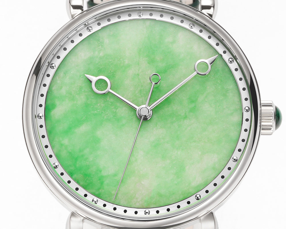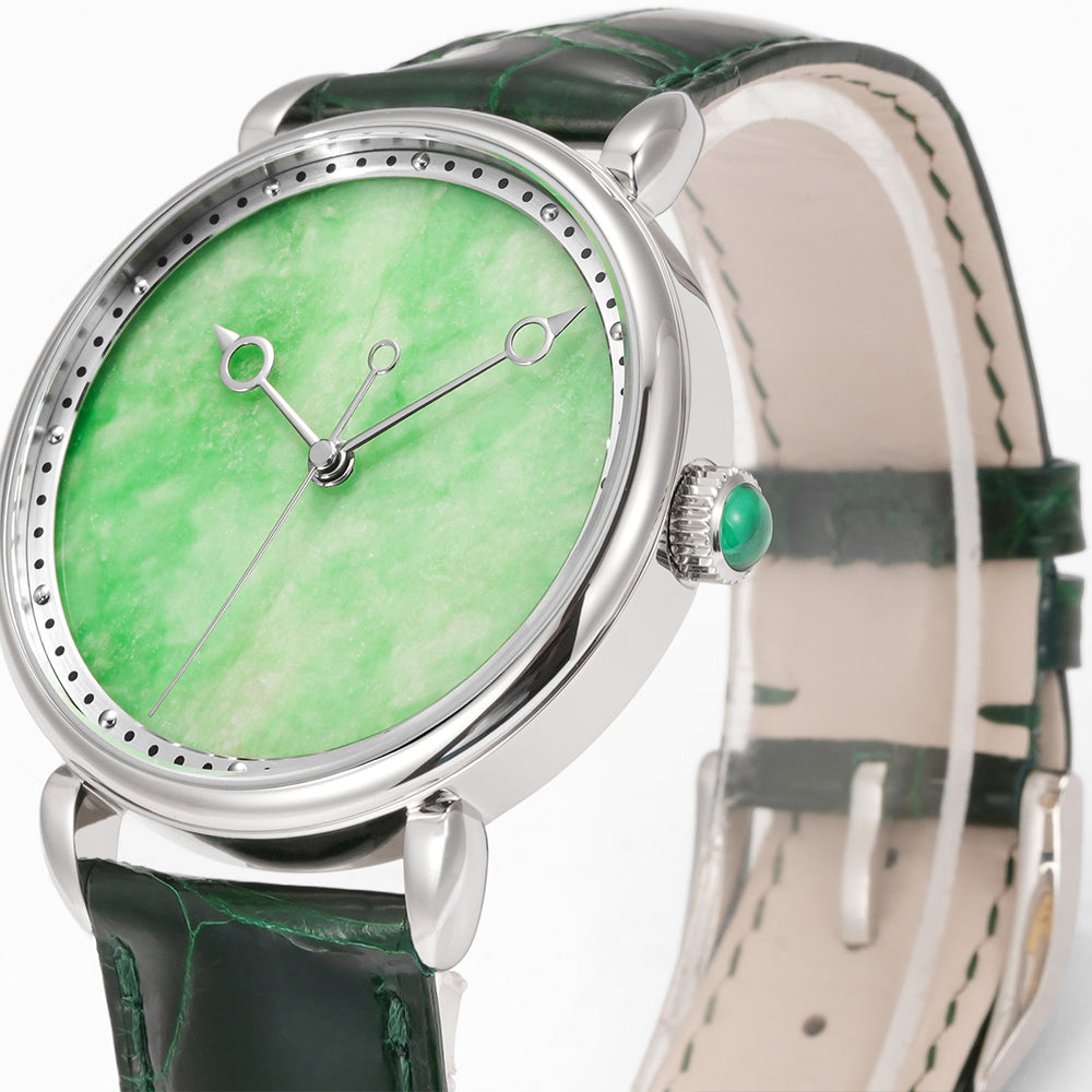 The HUASUO gemstone dial is made of natural gemstones or jadeite. Each dial presents a different texture.