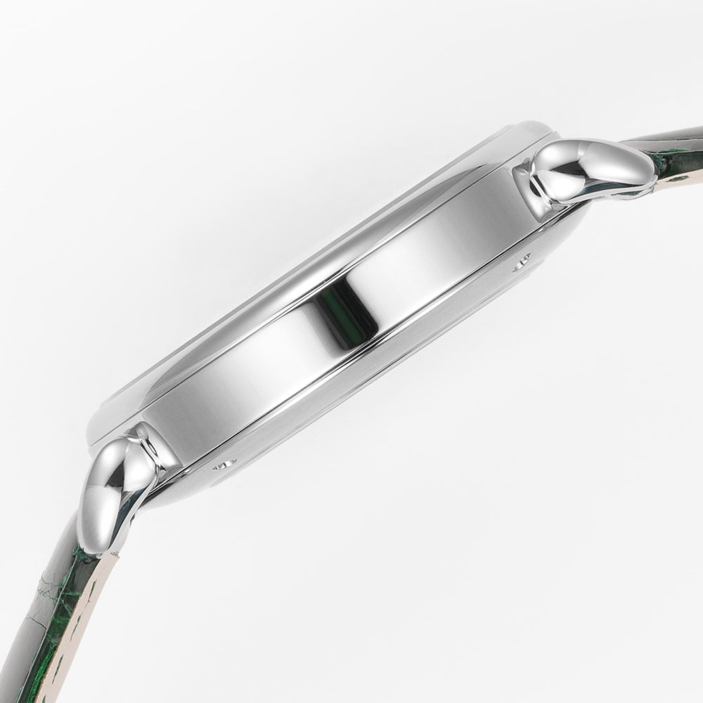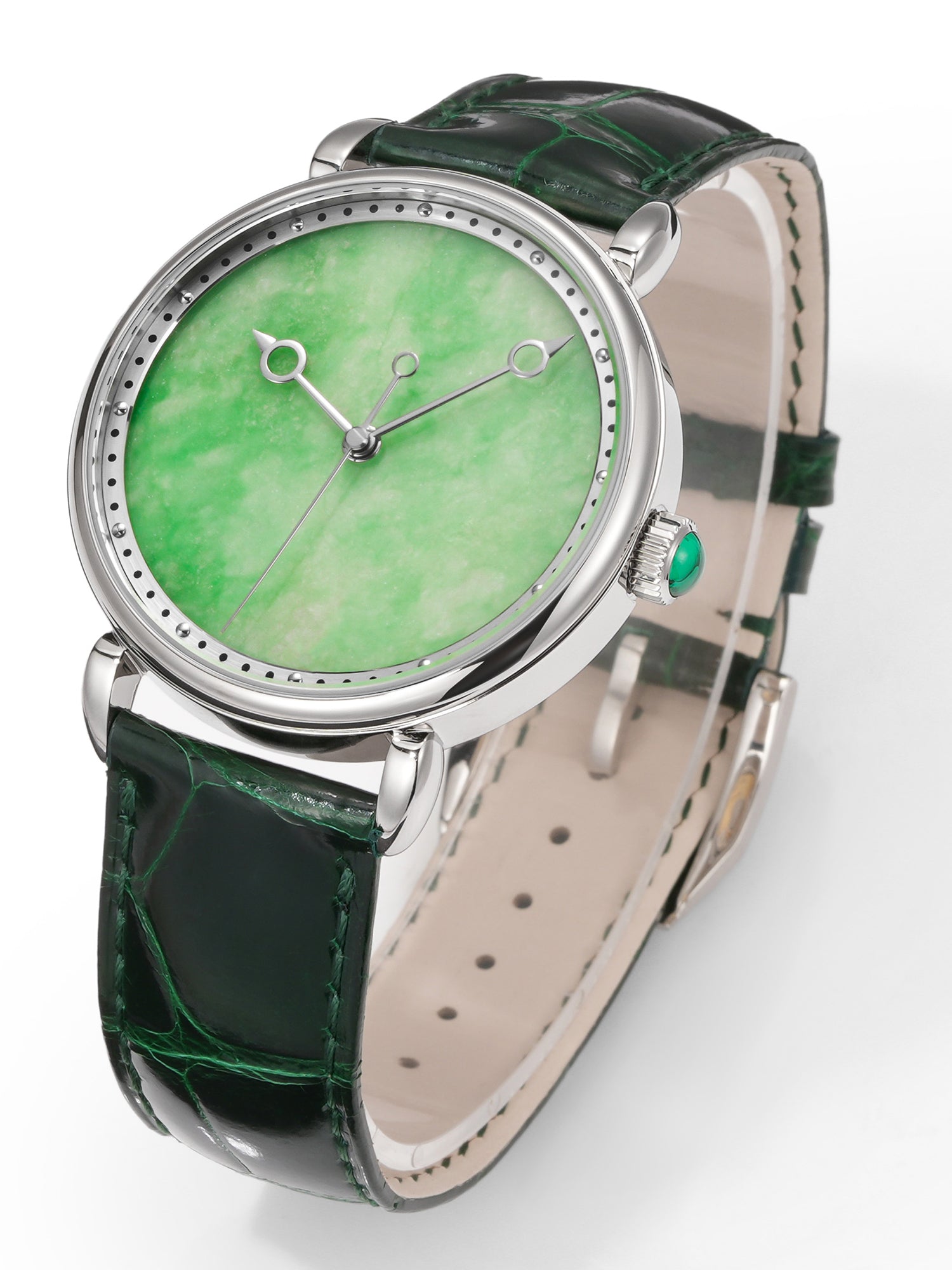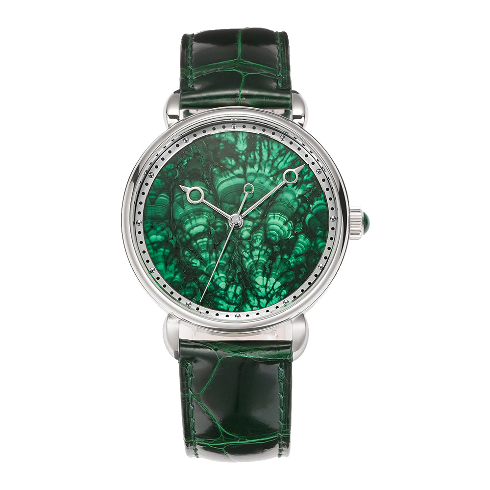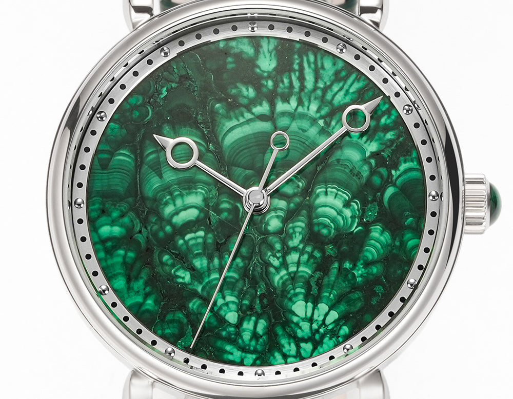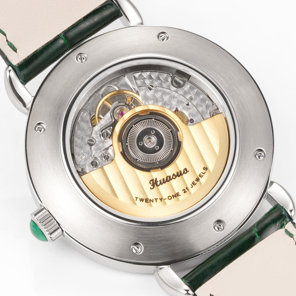 The HUASUO gemstone dial is made of natural gemstones or jadeite. Each dial presents a different texture.