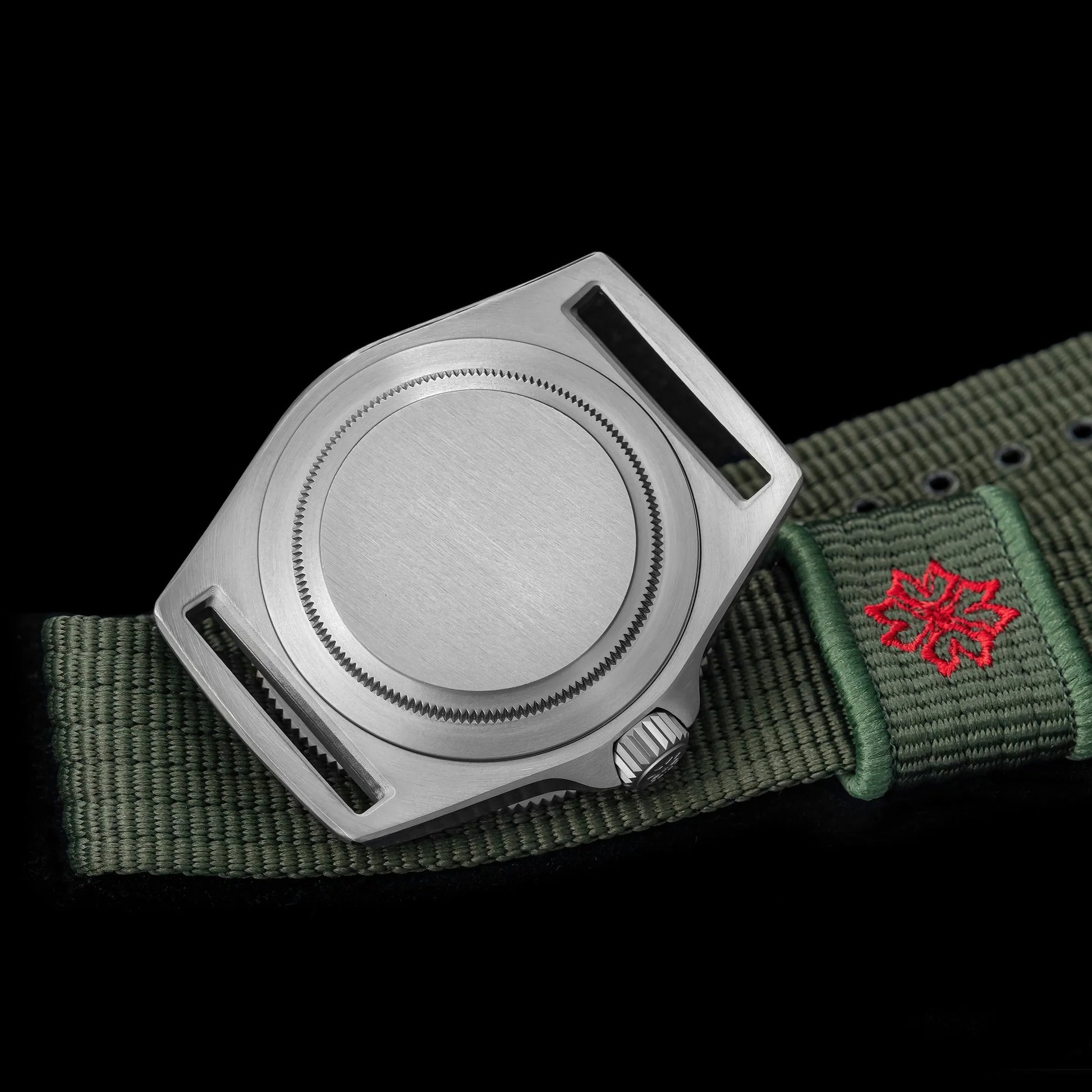 Band: Green one-piece fabric strap with titanium pin buckle.
